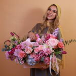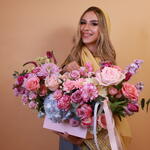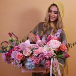 A stunning floral arrangement featuring a harmonious blend of roses, hydrangea, carnations, and seasonal blooms in soft blush and pink tones. Presented in a modern flower box with elegant accents, this composition radiates charm and sophistication. Perfect for celebrating International Women’s Day and showing appreciation to the wonderful women in your life.