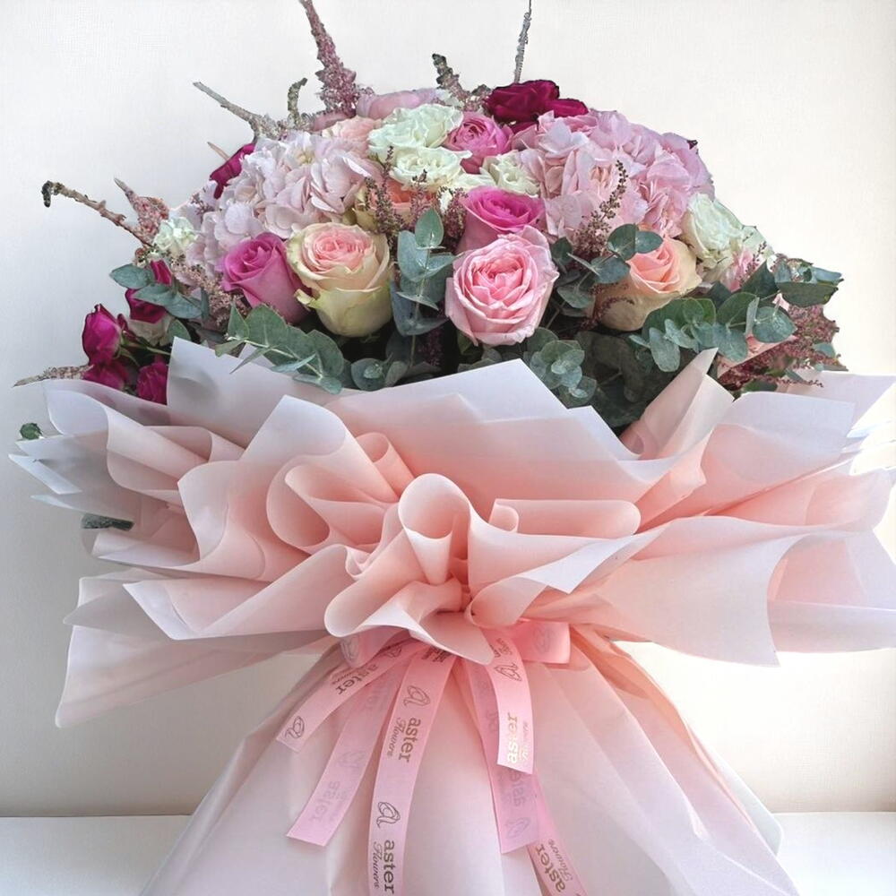 A romantic dream in shades of blush, cream, and fuchsia — this bouquet is the essence of elegance and charm. Featuring voluminous hydrangeas, classic and spray roses, and feathery pink astilbe, its beautifully framed by soft eucalyptus leaves and wrapped in layers of delicate pink designer paper. This arrangement is perfect for birthdays, anniversaries, or any heartfelt occasion that calls for grace and sophistication. To maintain freshness, trim the stems at an angle and place the bouquet in clean water. Refresh the water every two days, and keep the flowers in a cool, shaded place away from direct sunlight.