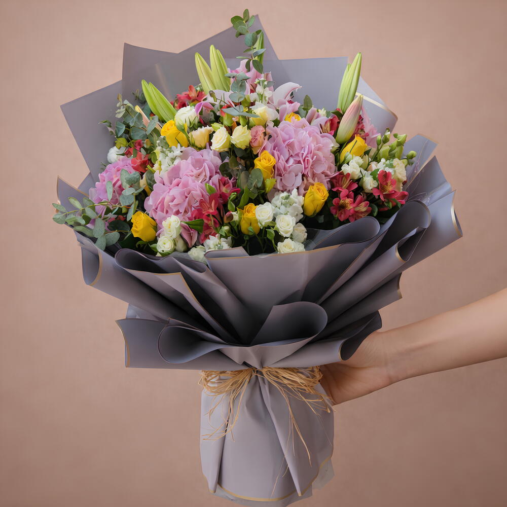 Delve into a world of romance with our enchanting bouquet featuring a harmonious blend of Pink Hydrangea, Oriental Pink Lily, Yellow Rose, delicate white spray roses, Peach Lisianthus, vibrant red Alstroemerias, all elegantly accented with fragrant eucalyptus leaves. Whether its a declaration of love or a gesture of admiration, this bouquet is sure to captivate hearts and ignite emotions.
