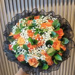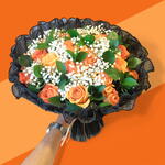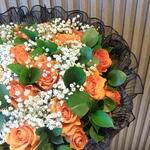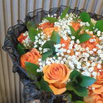 A captivating bouquet of sunset-toned roses, delicately accented with babys breath. This arrangement exudes warmth and elegance, perfect for any special occasion.