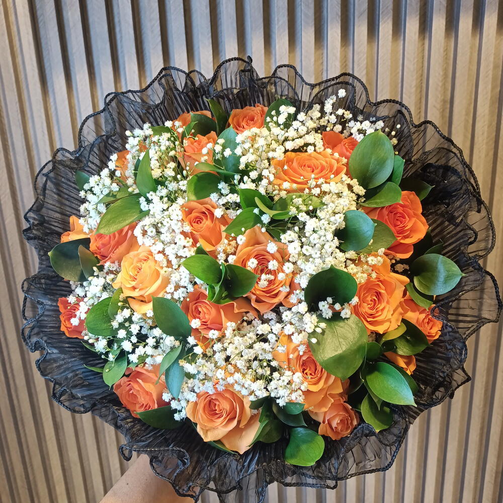 A captivating bouquet of sunset-toned roses, delicately accented with babys breath. This arrangement exudes warmth and elegance, perfect for any special occasion.