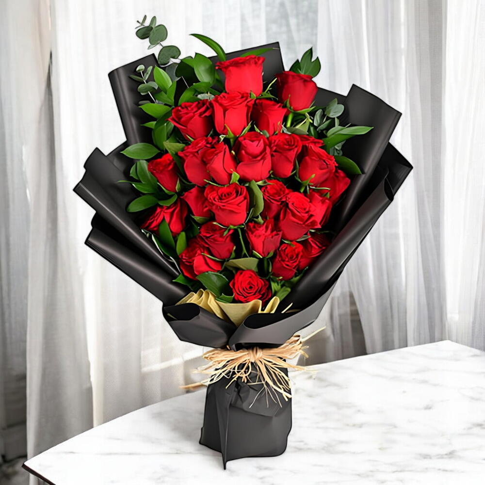 25 Red Roses. Beautifully accented with ruscus leaves and eucalyptus. Elegantly wrapped in black paper. Let the Love Red Roses Bouquet be a reflection of your sincere sentiments, creating a memorable display of love and appreciation.