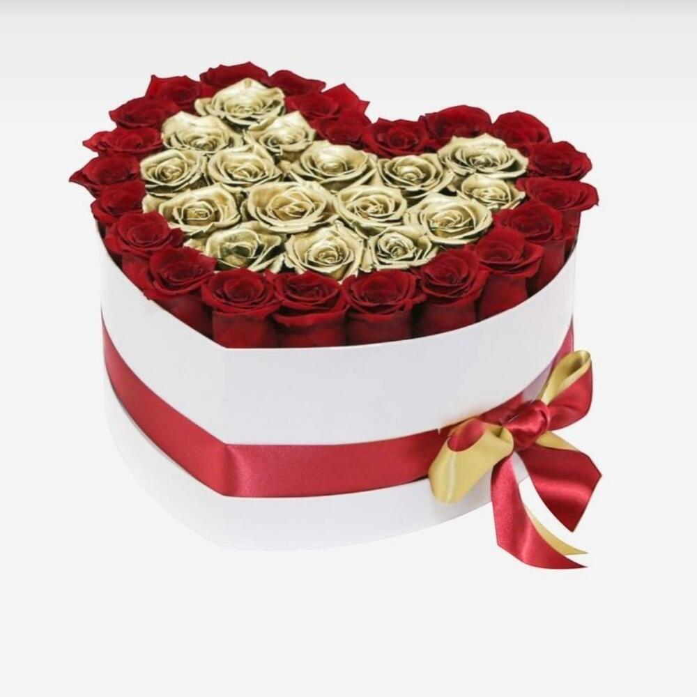 A heart-shaped box of 21 red roses and 15 gold roses — a luxurious symbol of passion, love, and everlasting romance.