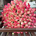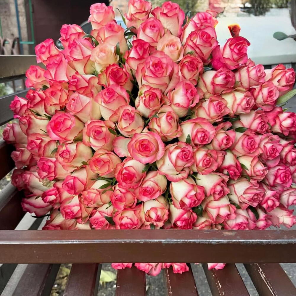 A delicate harmony of color and grace, this bouquet features stunning cream roses kissed with vibrant pink edges. Each bloom bursts with charm, blending softness and passion in every petal. Expertly hand-tied and finished with a matching pink ribbon, this arrangement is perfect for birthdays, romantic gestures, or simply to brighten someone’s day. The fresh green foliage enhances the vivid tones of the roses, making the bouquet truly unforgettable. It’s not just flowers—it’s a poetic expression of affection and admiration. Let your love bloom beautifully with this elegant floral creation.