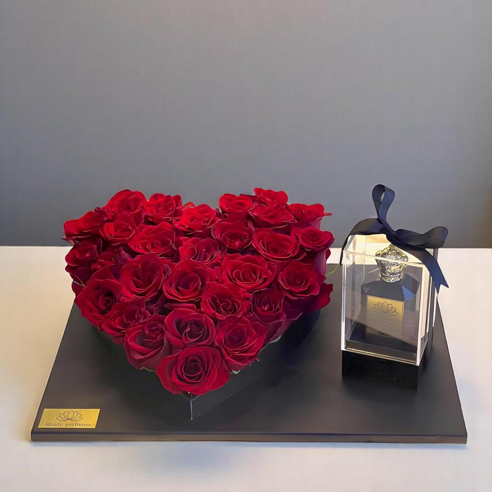 red roses - 20 pcs red baby roses - 5 pcs a 100ml bottle of story perfume - 1 pcs