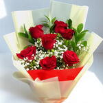Radiate romance with the Eternal Love Bouquet, a timeless expression of deep affection and heartfelt sentiment. Featuring 7 lush red roses — each symbolizing love, admiration, and devotion — this bouquet is designed to leave a lasting impression. Nestled among airy gypsophila (baby’s breath) and glossy ruscus greens, these blooms are wrapped in elegant cream-toned paper and finished with a luxurious red satin ribbon. Care Instructions: Keep the bouquet in a cool, shaded area away from direct sunlight. Trim the stems slightly and place them in clean water if transferring to a vase. Mist lightly to keep the greens fresh and avoid placing near heat sources or cold drafts.
