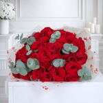 Celebrate love with timeless elegance through Romantic Bliss Red Rose Gift Set – FaVish Blooms, a beautifully curated arrangement designed to express deep emotion and heartfelt affection. Featuring 35 premium red roses, each bloom symbolizes love, passion, and devotion, creating a rich and captivating display. Accented with fresh eucalyptus leaves, the arrangement gains a refined, contemporary touch with added texture and natural freshness. Wrapped in charming heart-printed designer sheets, the bouquet exudes romance while maintaining a modern, stylish appeal. Thoughtfully paired with a delightful “I Love You” chocolate selection for a sweet expression of love and complemented by a luxurious scented jar candle to create a warm, intimate ambiance, this set transforms any moment into a memorable experience. Perfect for anniversaries, romantic surprises, or special celebrations, Romantic Bliss Red Rose Gift Set – FaVish Blooms is a graceful expression of love, designed to impress and be cherished.