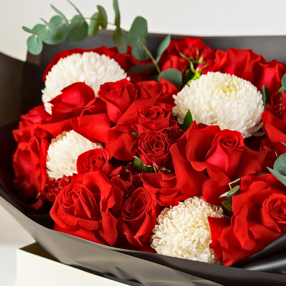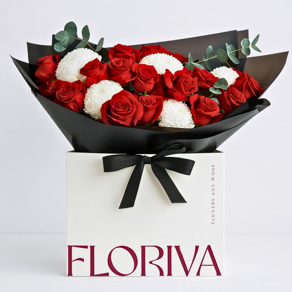 Celebrate powerful emotion and timeless beauty with Eternal Passion, Floriva’s bold and luxurious floral arrangement crafted to leave a lasting impression. Featuring vibrant red roses paired with elegant white chrysanthemums, Eternal Passion brings together the perfect harmony of intensity and purity. The dramatic black wrapping and signature Floriva box elevate the design, making Eternal Passion an exceptional gift for romantic celebrations, anniversaries, heartfelt gestures, or any moment where passion deserves to be expressed. Meticulously arranged with premium blooms and rich greenery, Eternal Passion embodies Floriva’s dedication to sophistication and unforgettable floral artistry.