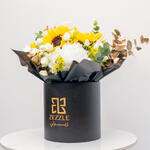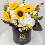 Nestled in a sleek Zezzle black box, this radiant arrangement features 5 cheerful sunflowers, 3 pristine white hydrangeas, 5 gold eucalyptus stems, and 10 delicate white spray roses. The sunflowers exude vibrant energy and optimism, while the white hydrangeas add an air of elegance and tranquility. The gold eucalyptus brings a touch of luxury, creating a shimmering contrast that enhances the overall beauty. The soft white spray roses complete the bouquet with their timeless grace, making this combination of bright and subtle hues a perfect symbol of enduring happiness, love, and elegance. The dark box elevates the brightness of the flowers, making this an extraordinary gift for any special occasion.