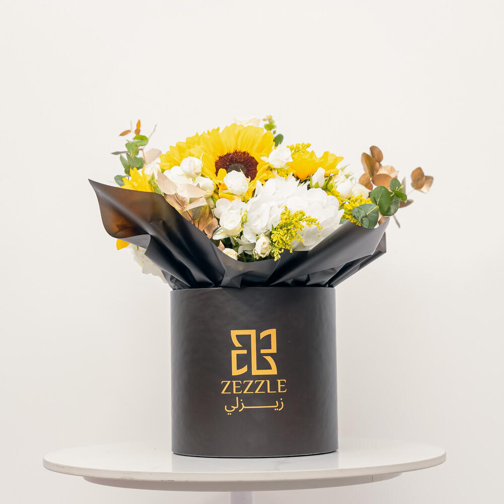 Nestled in a sleek Zezzle black box, this radiant arrangement features 5 cheerful sunflowers, 3 pristine white hydrangeas, 5 gold eucalyptus stems, and 10 delicate white spray roses. The sunflowers exude vibrant energy and optimism, while the white hydrangeas add an air of elegance and tranquility. The gold eucalyptus brings a touch of luxury, creating a shimmering contrast that enhances the overall beauty. The soft white spray roses complete the bouquet with their timeless grace, making this combination of bright and subtle hues a perfect symbol of enduring happiness, love, and elegance. The dark box elevates the brightness of the flowers, making this an extraordinary gift for any special occasion.