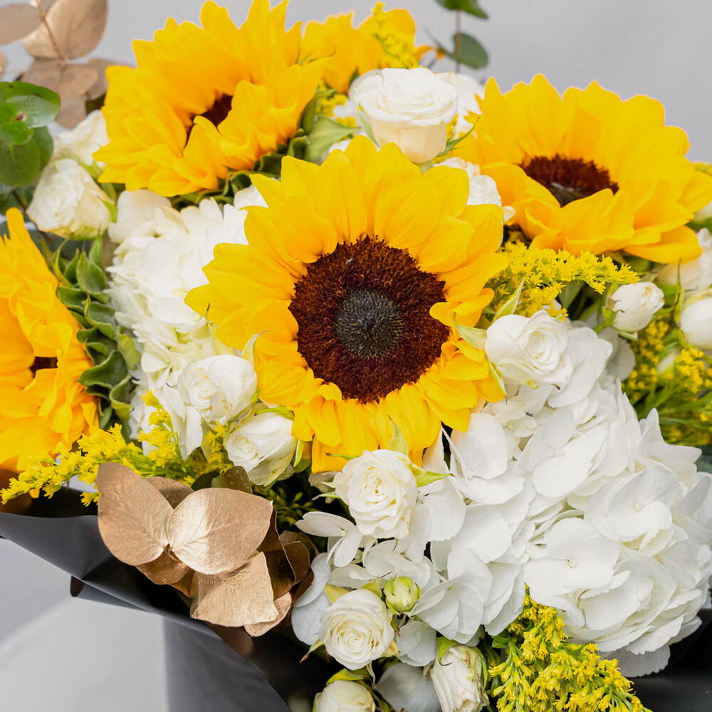 Solidago - 8 pcs hydrangea white - 3 pcs spray rose white - 8 pcs sun flower - 5 pcs eucalbtus green - 4 pcs black zezzle box - 1 pcs eucalbtus gold - 4 pcs