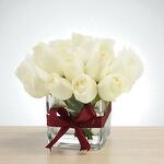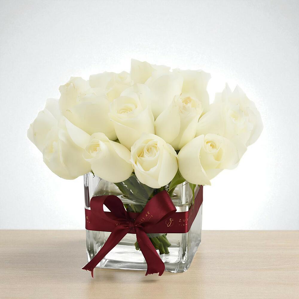 Pure, elegant, and timeless — the Eternal White in Glass Vase features 21 pristine white roses, artfully arranged in a 12x12 Square glass vase. Accented with a deep crimson ribbon, this design blends minimalism with sophistication, making it ideal for expressing love, admiration, gratitude, or heartfelt condolences. The lush, velvety blooms convey sincerity and purity, creating a gift that’s as meaningful as it is beautiful. Whether for a romantic occasion, a thoughtful thank-you, or a moment of sympathy, this arrangement makes a lasting impression.
