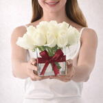 Pure, elegant, and timeless — the Eternal White in Glass Vase features 21 pristine white roses, artfully arranged in a 12x12 Square glass vase. Accented with a deep crimson ribbon, this design blends minimalism with sophistication, making it ideal for expressing love, admiration, gratitude, or heartfelt condolences. The lush, velvety blooms convey sincerity and purity, creating a gift that’s as meaningful as it is beautiful. Whether for a romantic occasion, a thoughtful thank-you, or a moment of sympathy, this arrangement makes a lasting impression.