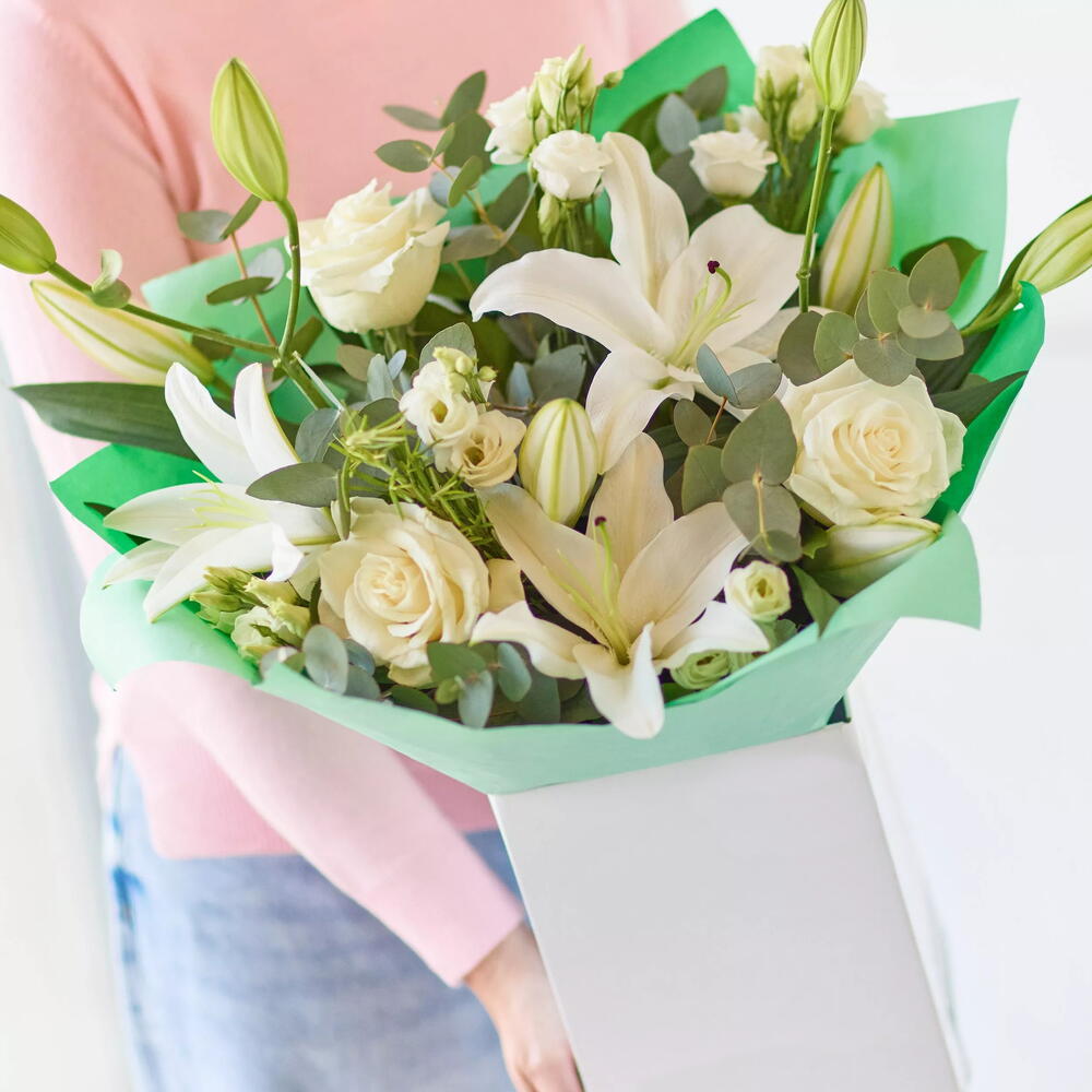 A stunning bouquet featuring elegant white lilies, delicate white roses, and fresh eucalyptus, exuding timeless beauty and natural charm.