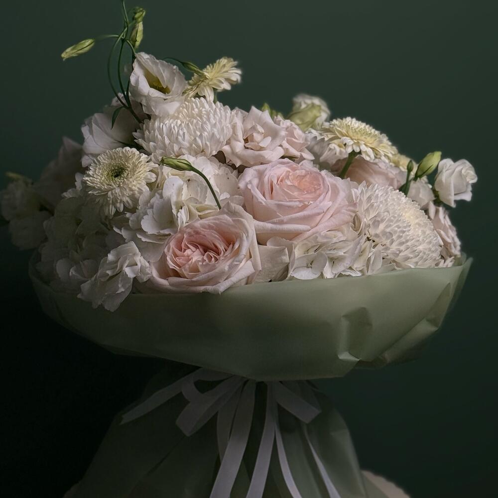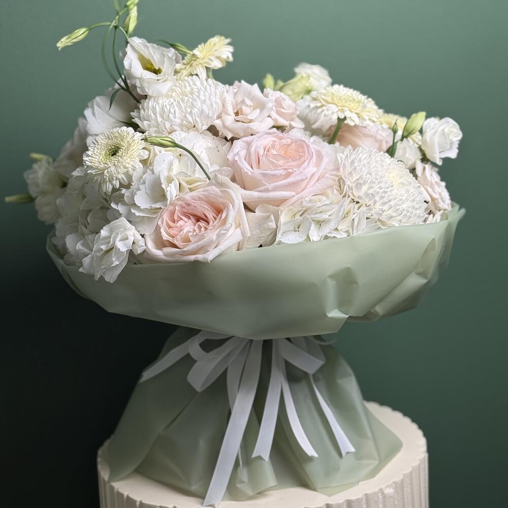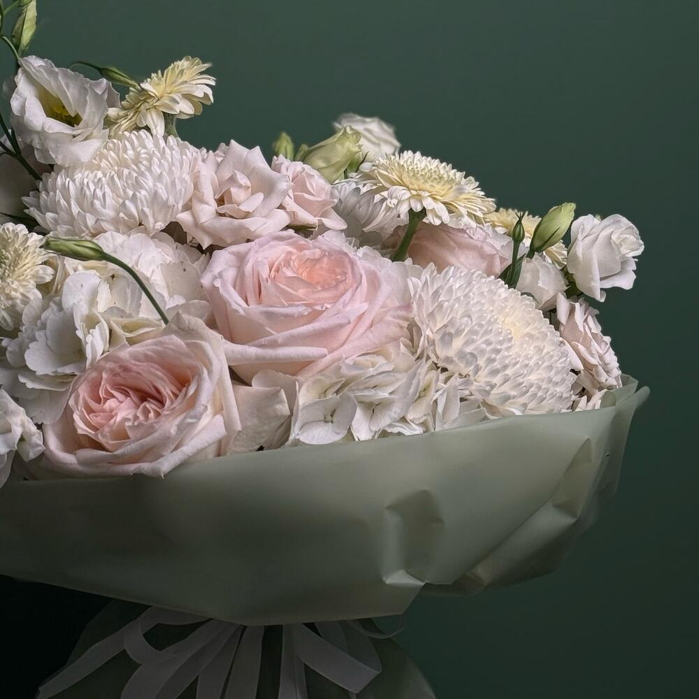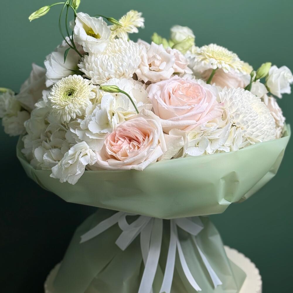 Soft as a sigh and tender as a memory, Ethereal Bloom is a bouquet of delicate blush roses, creamy chrysanthemums, elegant lisianthus, and cloud-like hydrangeas, all wrapped in a serene mint-green wrap with satin white ribbons. This arrangement radiates calm, purity, and understated sophistication—perfect for weddings, new beginnings, or heartfelt moments. A graceful gesture from Blooms Culture, where every bloom tells a story.