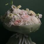 Ribbon - 1 pcs rose white - 8 pcs gerbera mini - 5 pcs hydrangea white - 3 pcs wrapping paper - 5 pcs estoma white - 5 pcs chrysanthemum single white - 5 pcs ecuador ohara rose - 5 pcs