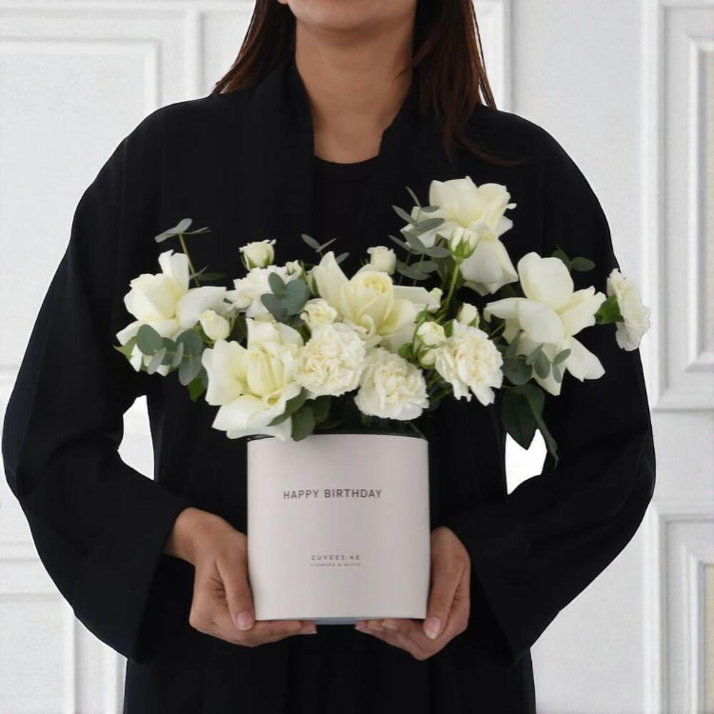 Delicate, refined, and effortlessly elegant – the Ethereal White Birthday Bundle is designed to express warmth and pure affection on their special day. This serene white floral arrangement features a stunning mix of 5 White Roses, 5 White Spray Roses, and 5 White Carnations, all complemented by fresh Eucalyptus foliage for a graceful finish. Nestled in a chic white Happy Birthday box, the arrangement is paired with luxurious Mirzam chocolates, a party hat, candles, a birthday card, and a festive confetti popper – making this an all-in-one celebration kit. Whether youre gifting a friend, surprising a parent, or honoring a colleague, this box radiates charm and sentiment with every petal and detail. Care Instructions: Keep the flowers in a cool spot away from direct sunlight, heaters, or air conditioning. If transferring to a vase, trim 1–2 cm off the stems at an angle and change the water every two days. The chocolate should be stored in a cool, dry place, and the accessories can be used for immediate celebration.