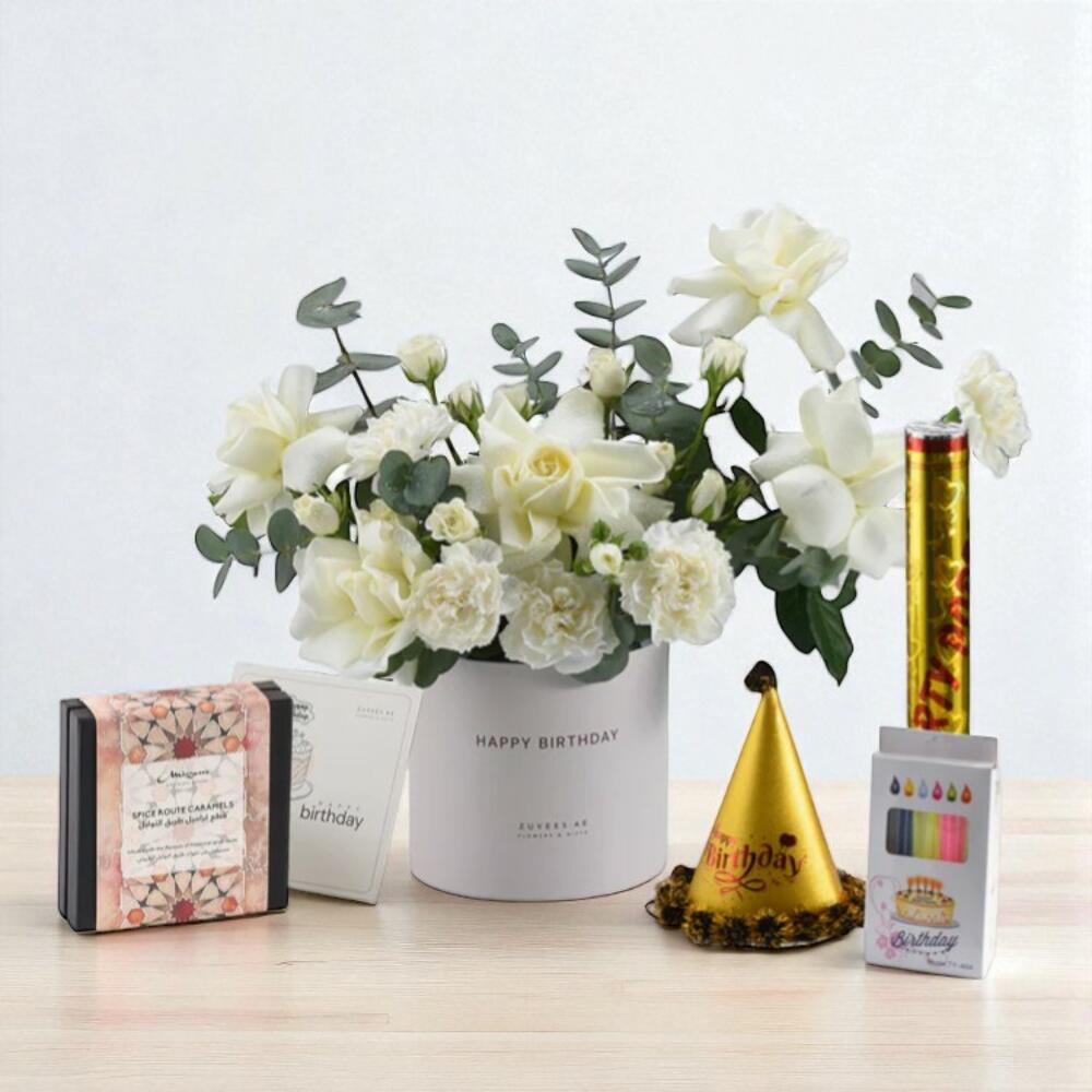 Ethereal White Birthday Flower Box with Chocolate Celebration Set