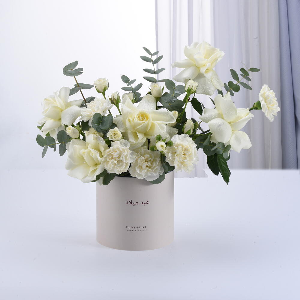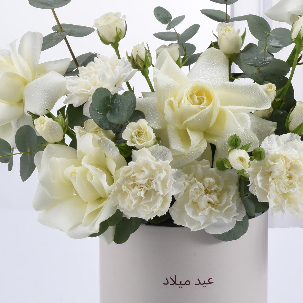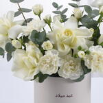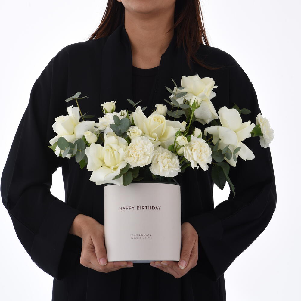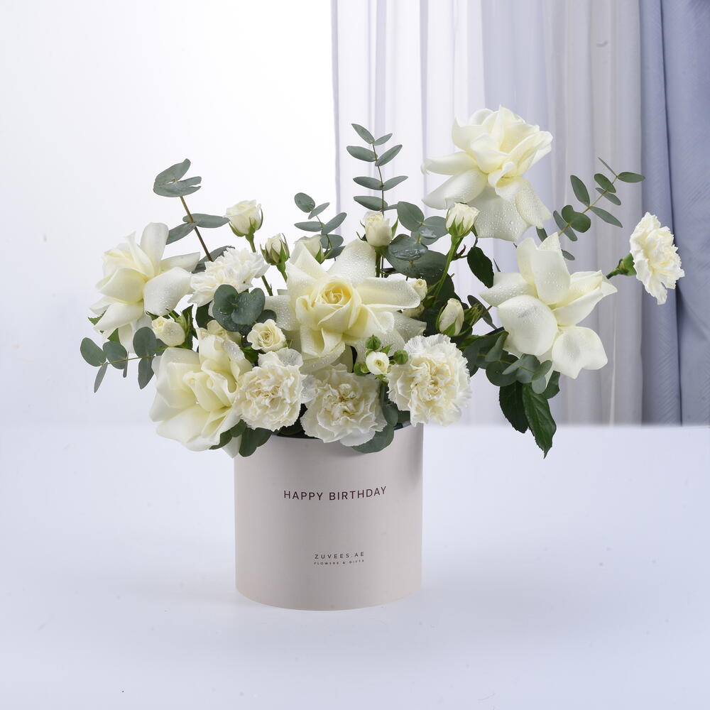 Ideal for: Birthday, Anniversary, Congratulations Ideal for: Her, Him Ideal for: Wife, Husband, Girlfriend, Boyfriend, Friend A graceful and sophisticated floral arrangement featuring delicate white blooms and lush eucalyptus, symbolizing purity and elegance. Thoughtfully arranged in a stylish ‘Happy Birthday’ box, this exquisite creation is a timeless way to celebrate love, joy, and new beginnings ✨ Please note: The box of this arrangement can be customized in different colors upon request. Available options include: White, Desert Sand, Sand Theme, Red Theme, Black Theme, and Black.