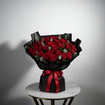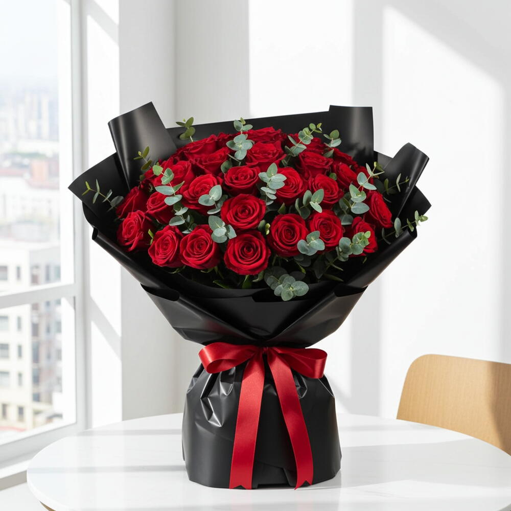 A stunning bouquet featuring 45 fresh red roses, accented with ruscus and eucalyptus, elegantly wrapped in black glossy paper, and finished with a red ribbon for a bold, luxurious, and romantic presentation. Make your Valentine feel truly special with this 45 red rose bouquet, accented with fresh ruscus and eucalyptus for a modern, elegant touch. Wrapped in glossy black paper with a red ribbon, it’s perfect for Valentine’s gifts, anniversaries, proposals, or grand romantic gestures. Ideal for same-day Valentine’s flower delivery, this bouquet is a premium choice from a trusted flower shop to express passion, love, and devotion beautifully.