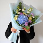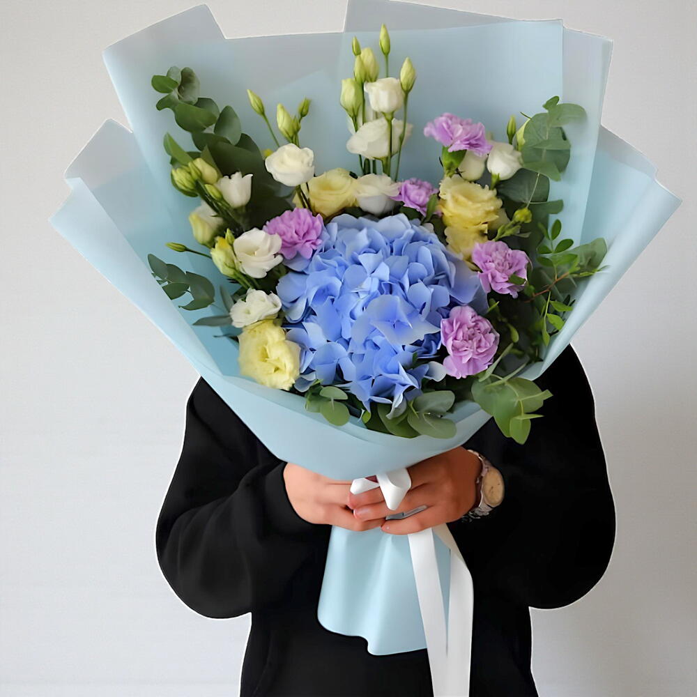 peach rose - 4 pcs blue hydrangea - 1 pcs purple carnation - 6 pcs stem ruscus - 3 pcs stem white eustoma - 4 pcs