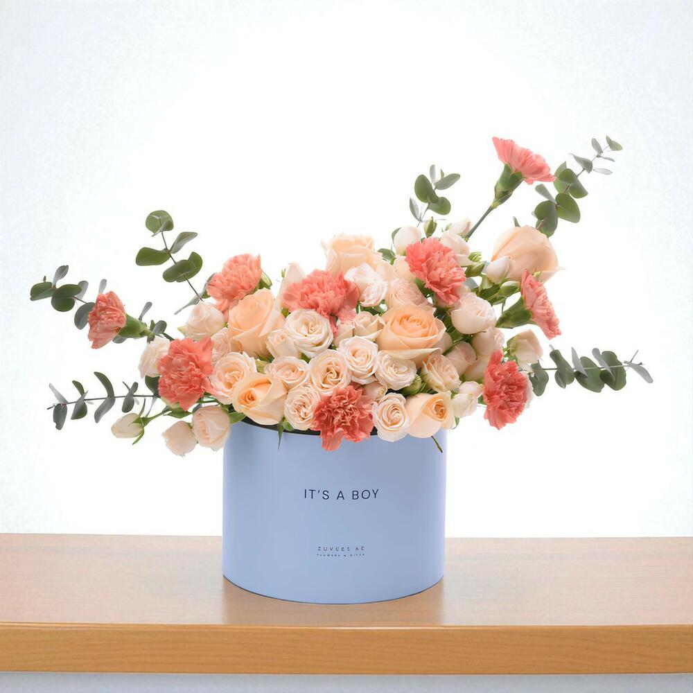 Experience the timeless enchantment of the Ever After Bloom Baby Boy Box, a luxurious floral masterpiece crafted to honor the arrival of a baby boy with radiant joy and warmth. Exquisitely presented in an elegant box adorned with the heartfelt inscription Its a Boy, this design exudes a vibrant charm and heartfelt celebration.