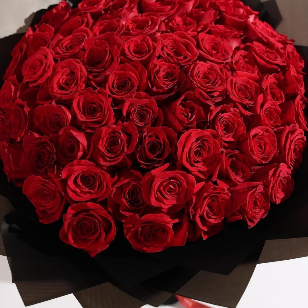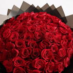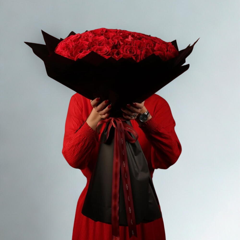Evermore is a statement of passion, love, and timeless elegance. Featuring 99 lush, open red roses, each bloom is carefully arranged in a luxurious black wrap and tied with a long, dramatic red ribbon, creating a bold, unforgettable visual impression. This large red rose bouquet is designed for those who want to express deep emotions with grandeur and style. Perfect for her, for him, or anyone you love deeply, Evermore captures the intensity of romantic love, passion, and devotion. Whether it’s an anniversary, a wedding proposal, a Valentine’s Day gift, or a grand romantic gesture, this luxury red rose arrangement conveys what words often cannot. Each rose is selected for freshness, size, and flawless openness, making it a premium bouquet that combines beauty, craftsmanship, and emotion. Send it from a lover, a spouse, a fiancé, or a friend to celebrate love, admiration, or gratitude. The Evermore bouquet is more than flowers — it’s a poetic gift, a statement of affection, and a luxurious floral masterpiece. Perfect for gifting, home décor, or luxury events, it is a signature creation from Majd Flowers Dubai, known for premium, handcrafted bouquets with same-day flower delivery in Dubai and across the UAE. Experience the intensity of 99 red roses, the elegance of a black wrap, and the drama of a long red ribbon — all in one unforgettable Evermore bouquet.