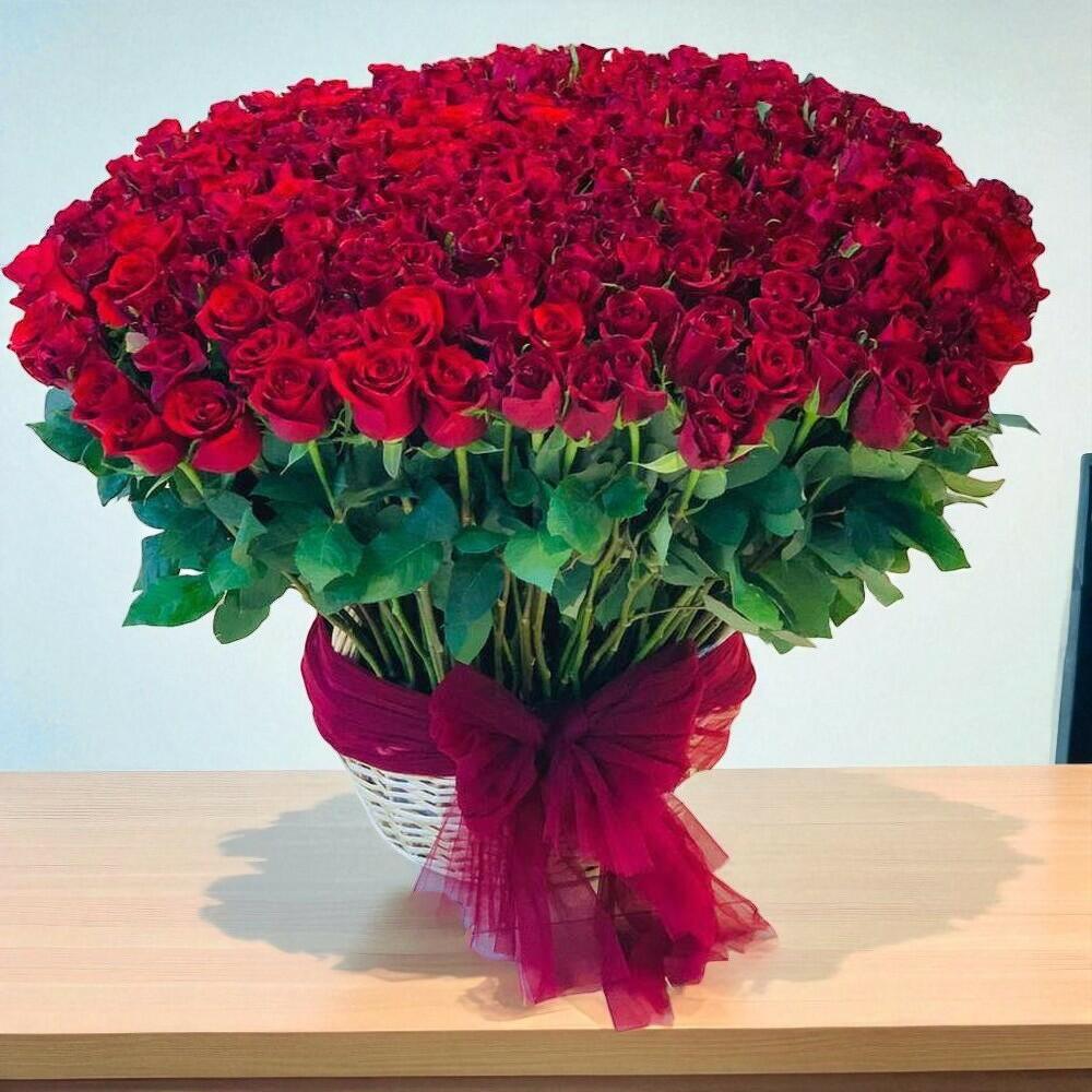 medium woodwn basket - 1 pcs every red roses - 301 pcs