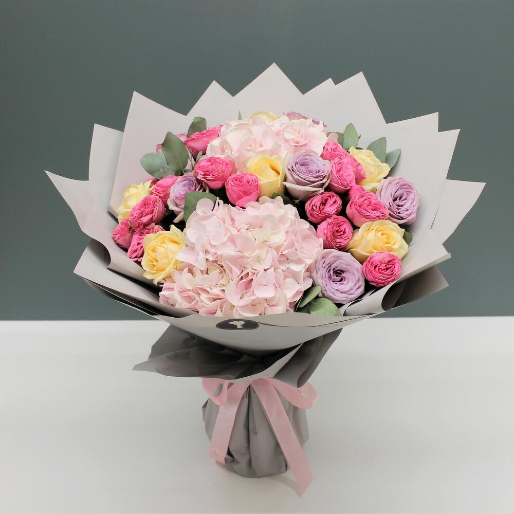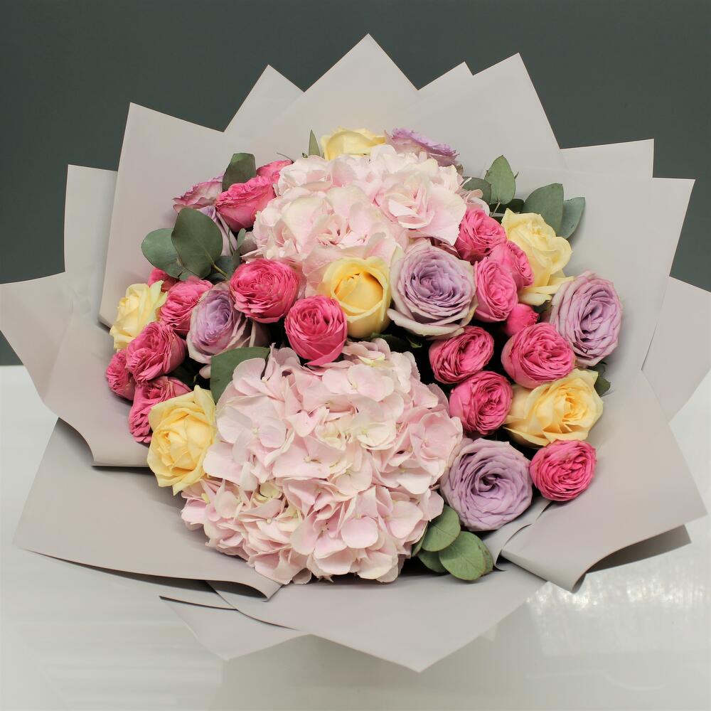 This exquisite bouquet includes two gorgeous pink hydrangeas, six lovely purple roses, six bright yellow roses, and five stems of dark pink garden spray roses. This beautiful combination of colors is perfect for any occasion, from weddings and birthdays to anniversaries and more.