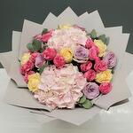 Yellow rose - 6 pcs hydrangea pink - 2 pcs purple rose - 6 pcs eucalyptus leaves - 4 pcs garden spray rose dark pink - 5 pcs