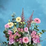 Alstroemeria - 2 pcs Gerbera - 4 pcs rose - 4 pcs chocolates - 16 pcs baby rose - 4 pcs astilbe pink - 2 pcs