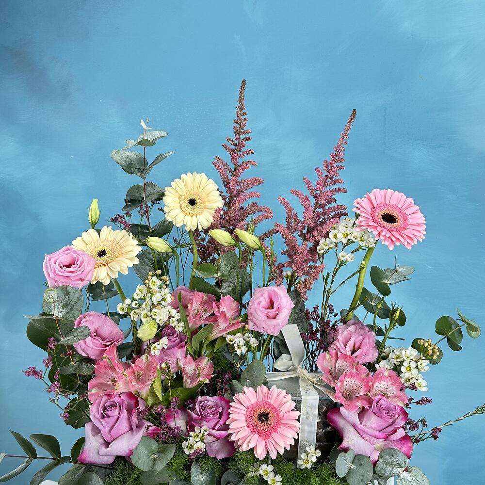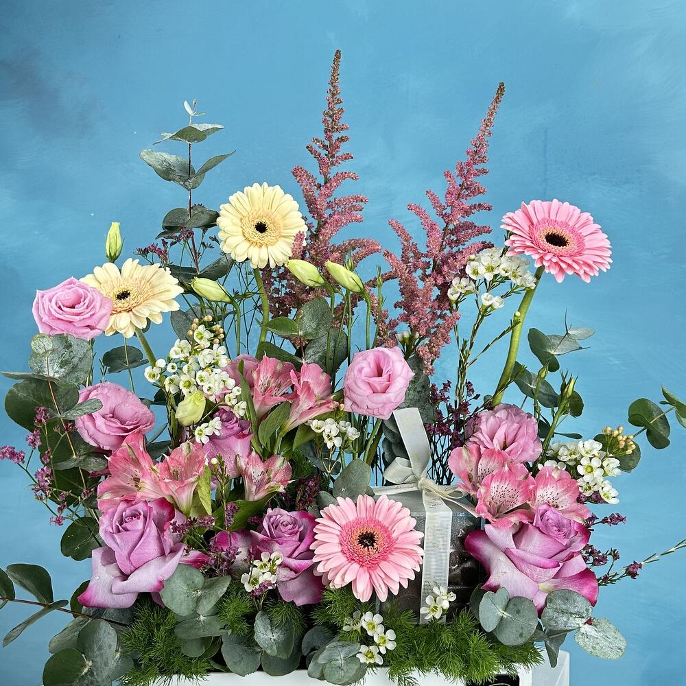 Alstroemeria - 2 pcs Gerbera - 4 pcs rose - 4 pcs chocolates - 16 pcs baby rose - 4 pcs astilbe pink - 2 pcs