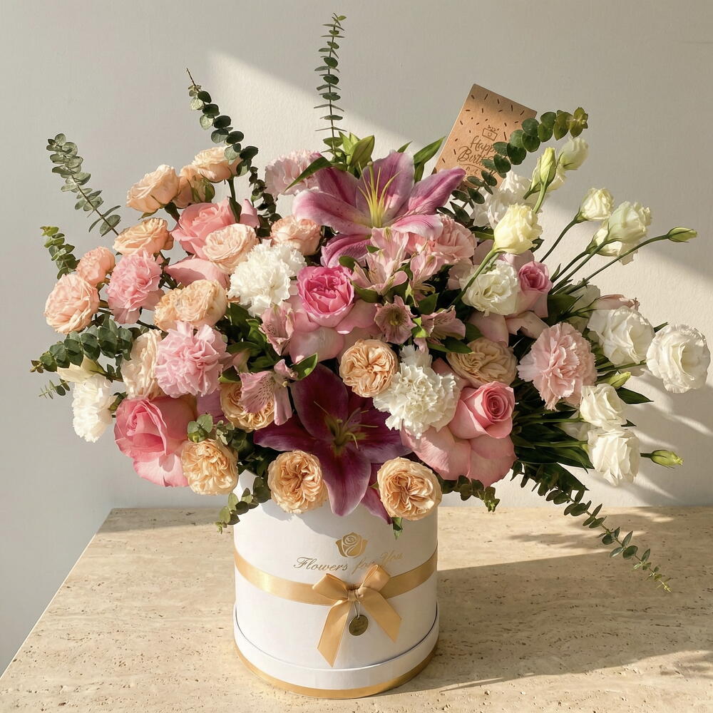 The Fatima Luxury Flower Box is an elegant floral arrangement designed to express warmth, grace, and refined beauty. Featuring soft pink roses, delicate white eustoma, romantic pink lilies, and a charming mix of carnations and spray roses, this premium flower box creates a lush, balanced composition in a sophisticated hat box presentation. Perfect for customers searching for luxury flower boxes in Dubai, pink rose arrangements, or elegant floral gifts for birthdays, anniversaries, Ramadan, or special celebrations, this arrangement offers timeless appeal. The harmonious palette of blush pink, ivory, and soft peach tones symbolizes admiration, gratitude, and gentle affection.