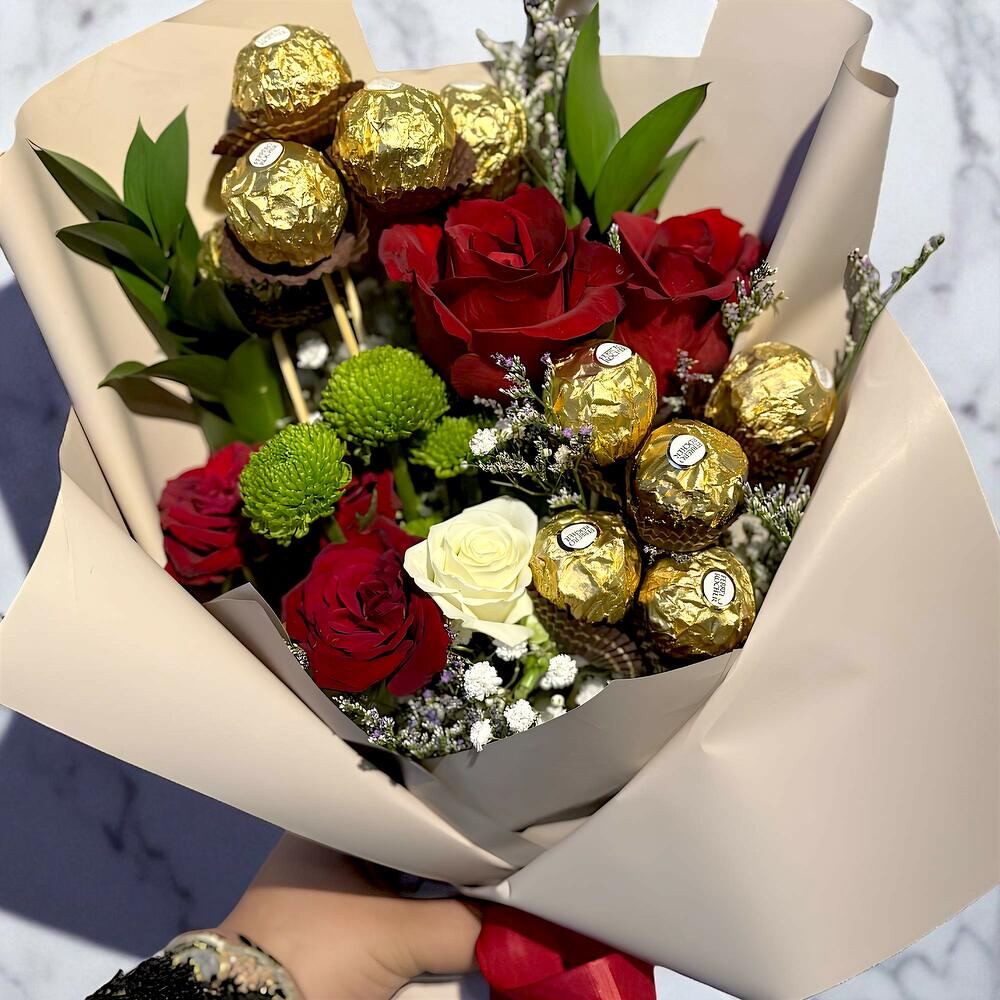 A luxurious bouquet combining elegant red and white roses, vibrant green chrysanthemums, delicate baby’s breath, and sprigs of limonium, beautifully accented with Ferrero Rocher chocolates for a touch of indulgence.