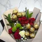 Red rose - 2 pcs Ruscus - 2 pcs Limonium - 1 pcs Ferrero rocher - 10 pcs baby rose stem - 10 pcs buttons stem - 1 pcs