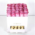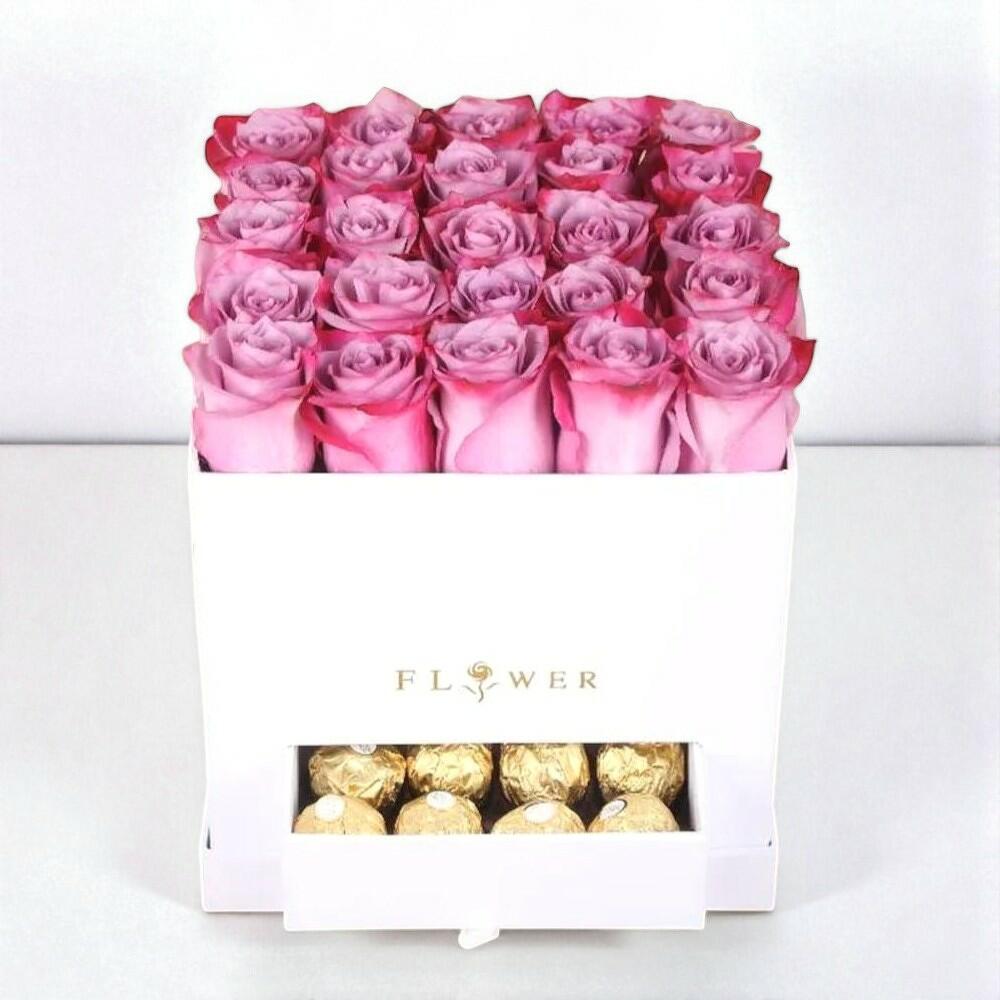 Stylish, sweet, and undeniably elegant—this box arrangement combines the timeless beauty of lavender roses with the irresistible delight of Ferrero Rocher chocolates. The top tier is filled with lush, perfectly aligned roses in a chic white square box, while a hidden drawer reveals a tempting selection of golden-wrapped chocolates. Keep the roses fresh by adding a few drops of water to the floral foam inside the box every 1–2 days and storing the box in a cool area. With proper care, the blooms will stay beautiful for up to 5–7 days. A premium presentation that fuses floral charm with gourmet indulgence. Ideal for those special moments like birthdays, anniversaries, or any heartfelt occasion, this flower box transcends the ordinary and becomes a tangible manifestation of love. Send it as a birthday gift, express anniversary wishes, convey get well soon sentiments, or simply wish a loving moment to someone dear. Anniversary, Birthday, Iam Sorry, New Baby, Suits any Occasion, Thank You, Wedding.