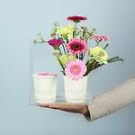 Combination of Garberas , carnations and other mix of flowers arranged with creamy cup in an acrlic bag