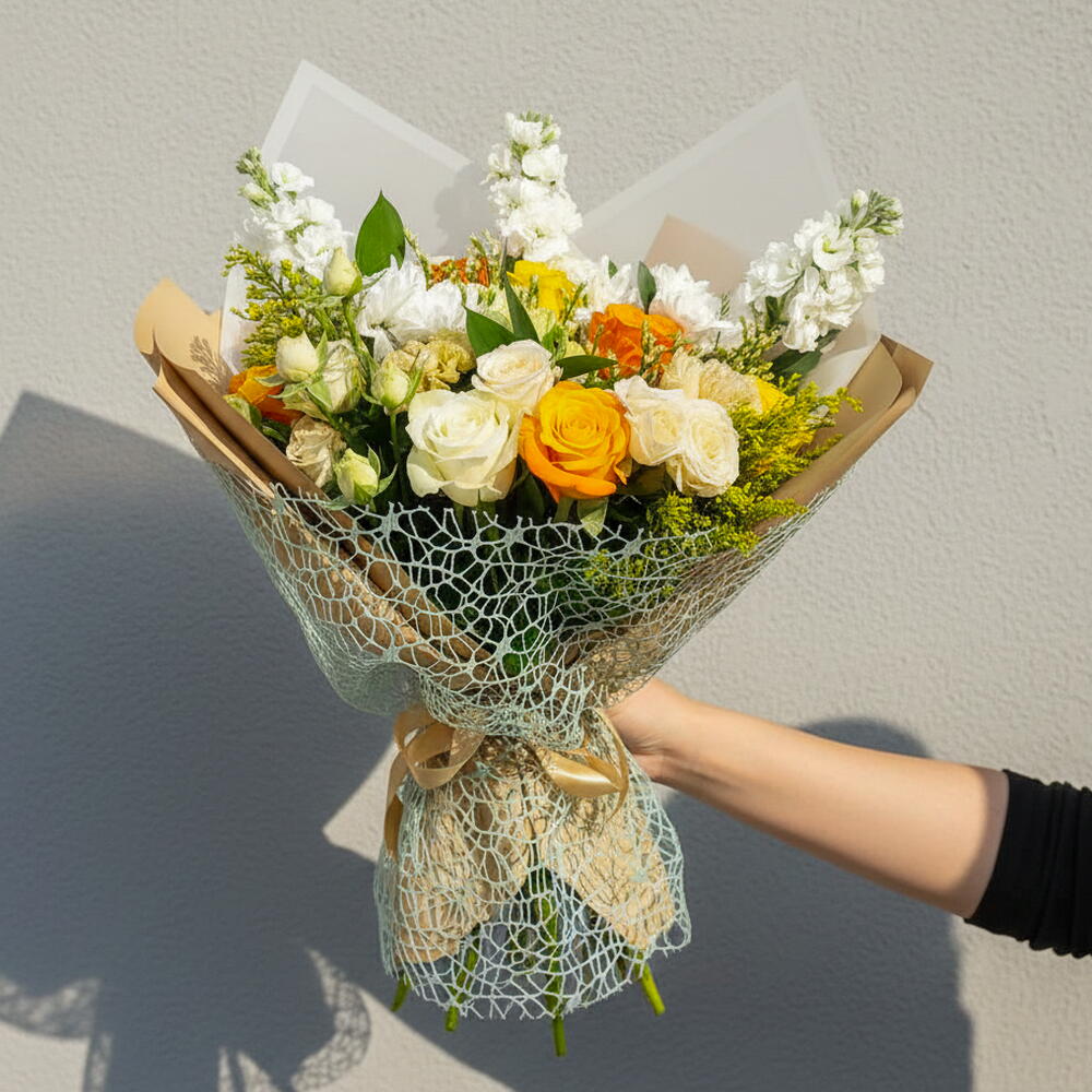 A fresh and elegant bouquet inspired by warm sunlight and natural harmony. Creamy white and golden yellow roses are beautifully complemented by soft orange accents and delicate greenery. Tall white blooms add lightness and graceful structure to the arrangement. Wrapped in stylish natural paper and decorative mesh, this bouquet feels organic and refined. The balanced color palette evokes warmth, optimism, and gentle joy. Perfect for celebrations, thank-you gifts, or uplifting moments. This bouquet brings a sense of freshness, beauty, and positive energy to any occasion.