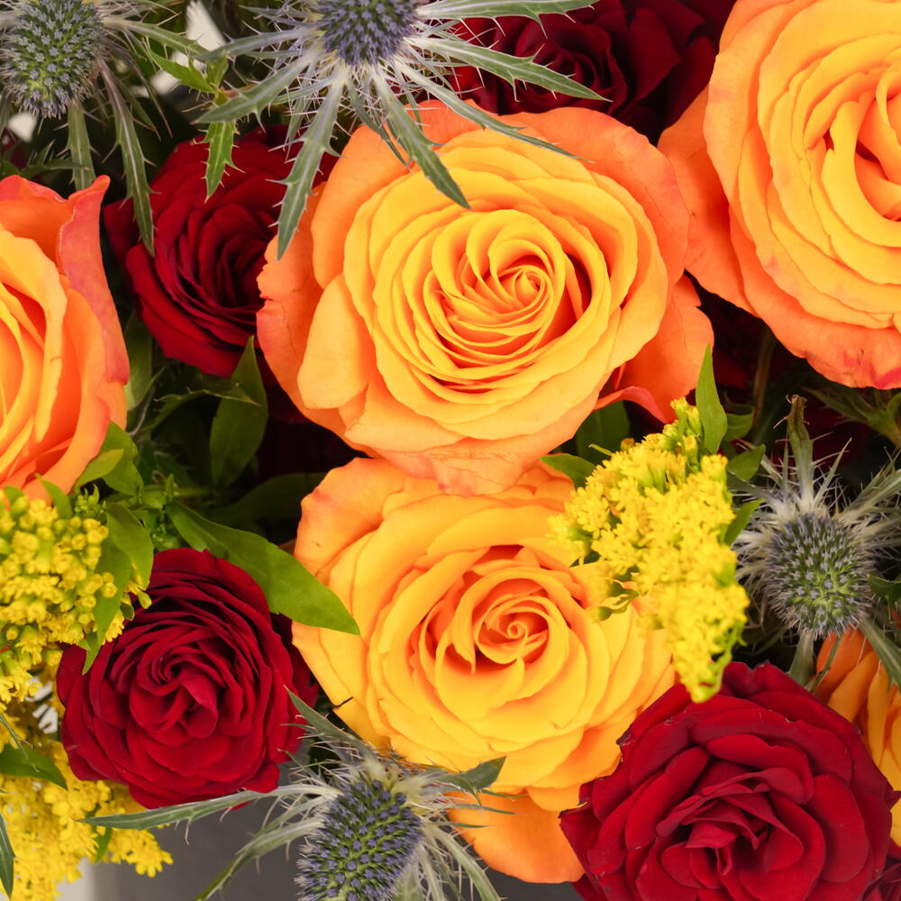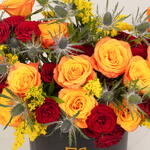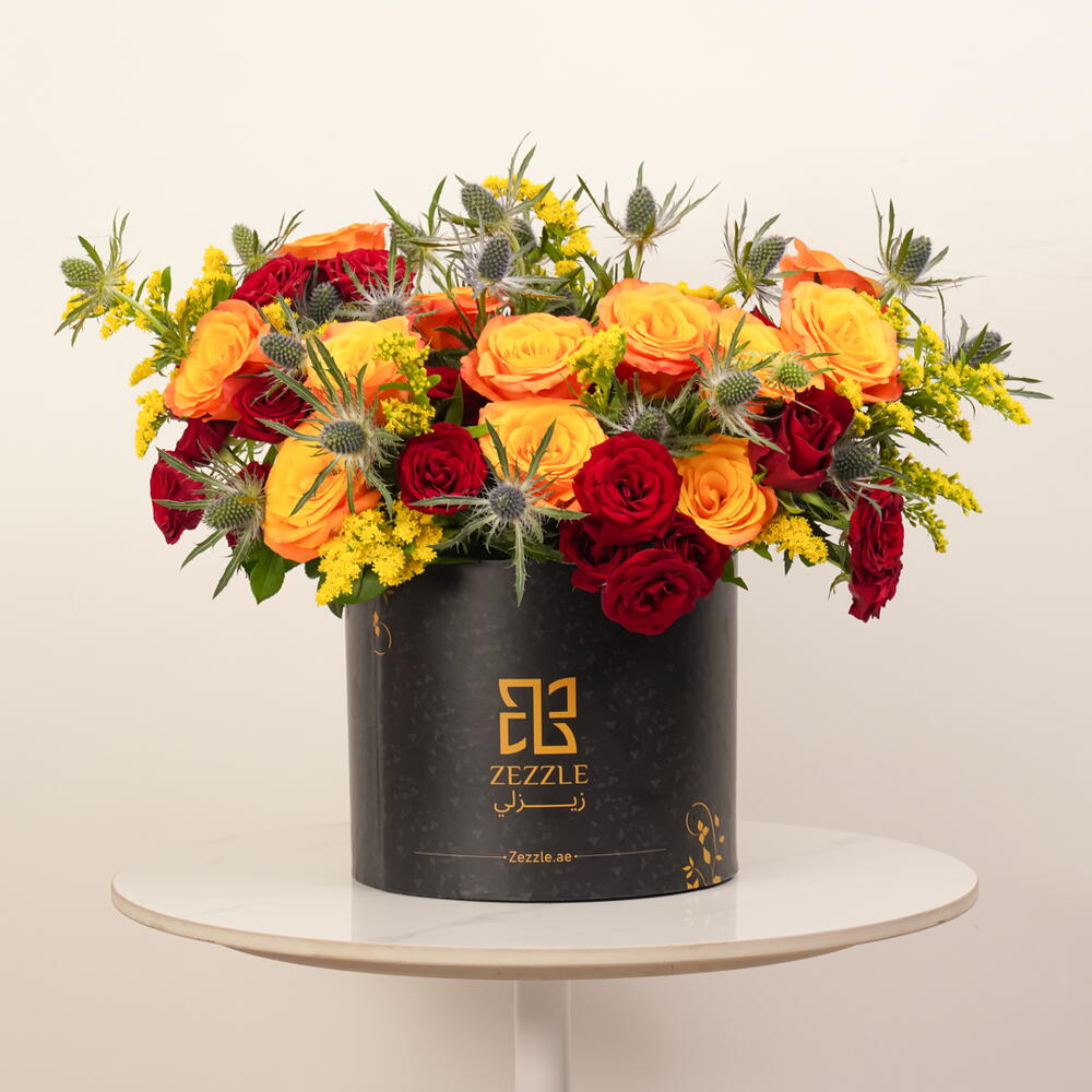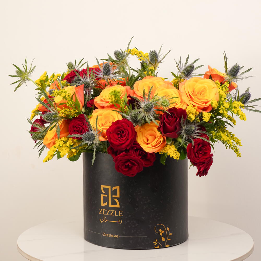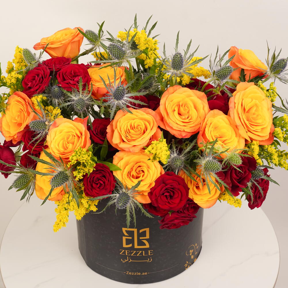Ignite the senses with Flame Elegance, a luxurious bouquet featuring 20 red roses, 20 orange roses, 10 eryngium, and 10 solidago, elegantly arranged in a black Zezzle round box. Perfect for gifting and special occasions, delivered across the UAE.