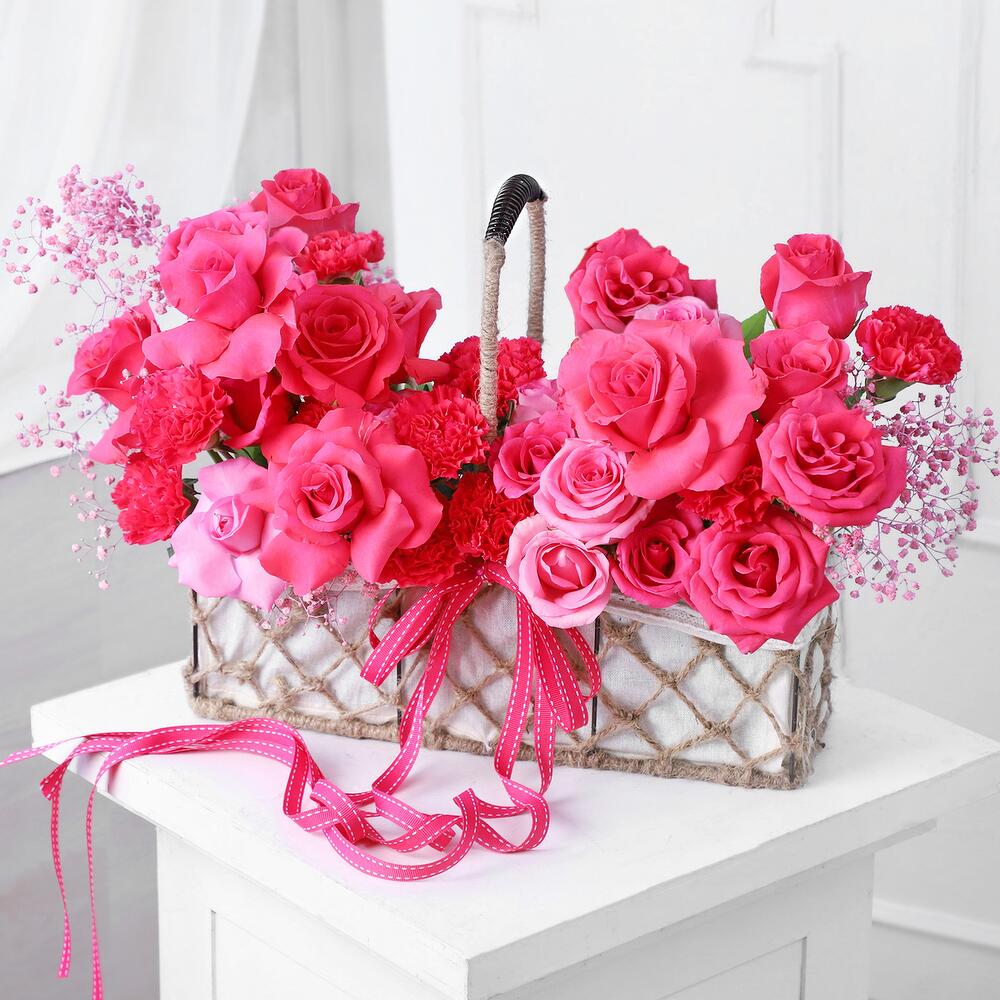 Passion is an energy that propels you on the path you wish to take. Inspire your loved ones with a sweet disposition that reflects their deep passion and invigorates them for whats to come - Dark pink roses, aqua pink roses, dark pink carnations, pink gypso and delicate kamini stems.