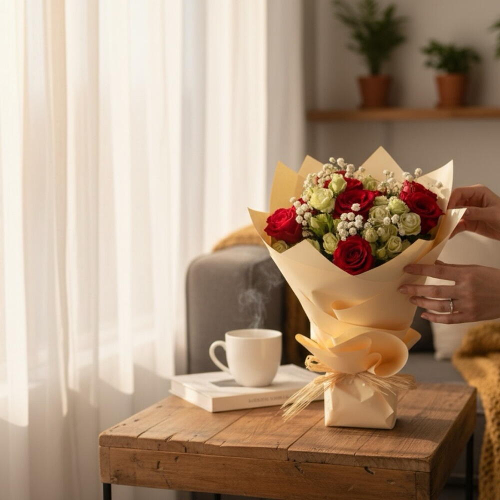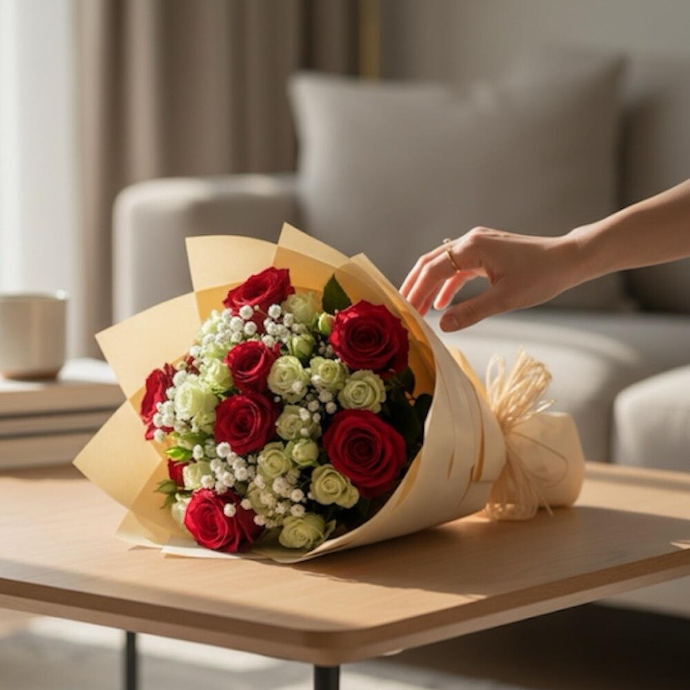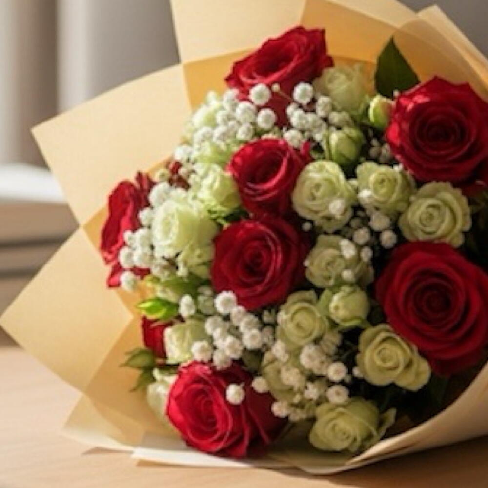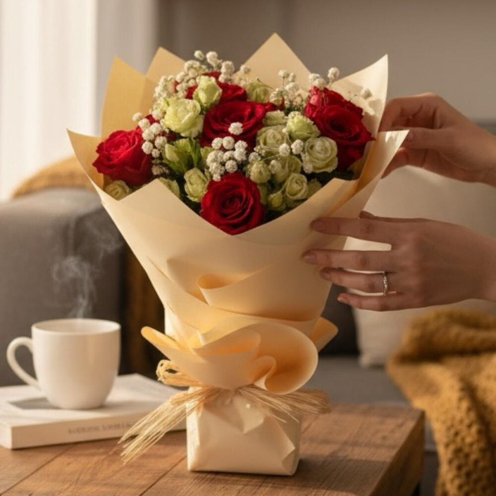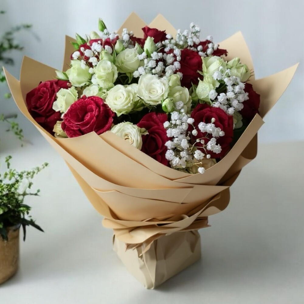 💐 Includes: • 9 Red Roses • 1 bunch Premium White Baby Roses • 3 Stems Of Babies Breath • Classic Creamy Brown Shade Wrapping • Creamy Raffia Ribbon • Free Personalized Card (IN ENGLISH) ❤️ Ideal for: Surprise | Anniversary | Gift | Just Because | Special Moments | Love | Any Occasion ⚠️ IMPORTANT NOTES: • Some flowers may be substituted with other flowers according to availability • If the wrapping is sold out, it’ll be substituted with another similar one - Some of our flowers may arrive in bud, ready to bloom