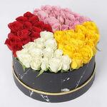 Product Details: 4 Stems Red Baby Roses 4 Stems White Baby Roses 4 Stems Pink Baby Roses 4 Stems Yellow Baby Roses Prepared in a Black Round Box