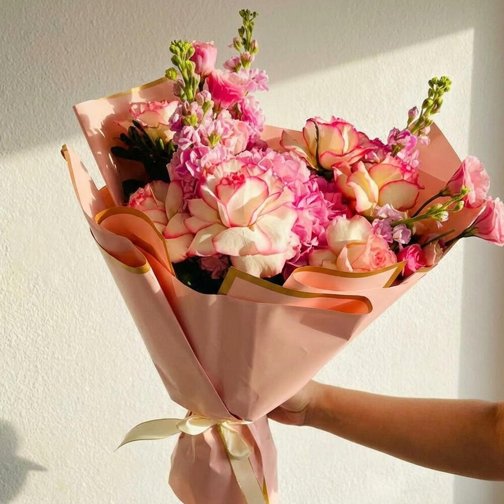 A graceful cascade of beauty, the Floral Drop bouquet showcases Paloma roses, pink hydrangea, and lisianthus with matthiola and lush foliage. A perfect gift for birthdays, anniversaries, or elegant home decor, this arrangement exudes timeless floral charm. Handcrafted with Paloma Roses and Hydrangea Pink, Includes lisianthus and matthiola for layered textures, Soft, romantic palette ideal for elegant gifting, Complemented by ruscus and pistachio leaves, Comes with flower food, gift bag, and message card tags: elegant pink flowers, floral gift for her, rose and hydrangea bouquet, soft color bouquet, floral gift set