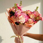 Ruscus - 5 pcs hydrangea pink - 1 pcs rose paloma - 8 pcs free flower food - 1 pcs lisanthus pink - 2 pcs matthiola double iron pink - 4 pcs blad pistachio ( bottom) - 3 pcs free gift bag message card - 1 pcs