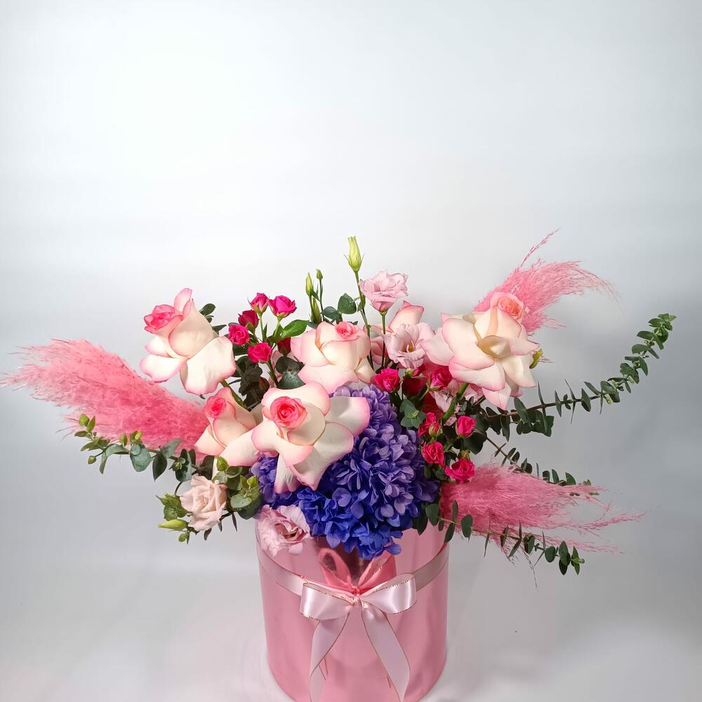 Eucalyptus - 5 pcs lisianthus pink - 4 pcs spray rose fushia - 3 pcs jumilia - 7 pcs dry pampas pink - 1 pcs dry hydrangea purple - 1 pcs