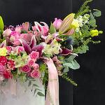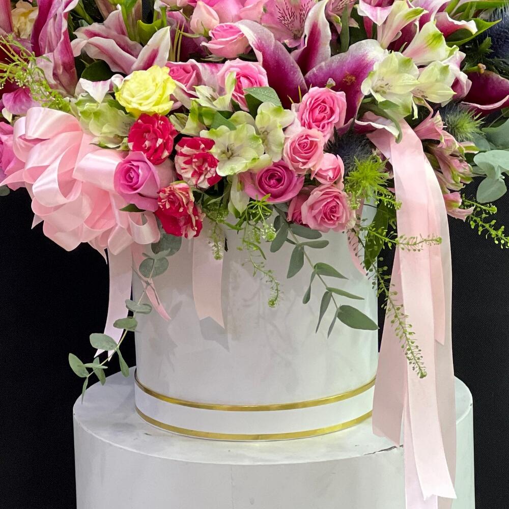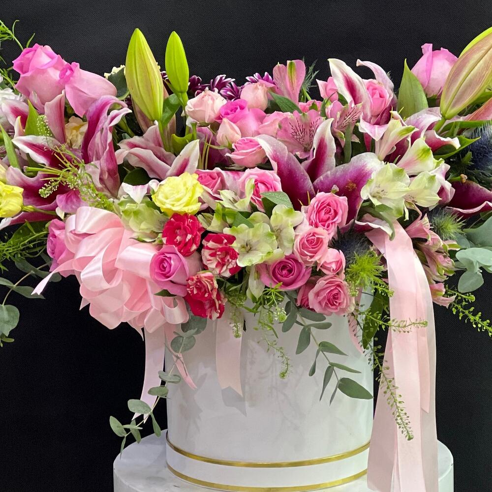 This exquisite Flowers in a Box arrangement boasts an enchanting blend of stunning blooms. It includes 5 graceful pink lilies, 5 vibrant spray chrysanthemums, 5 charming eustoma, 8 romantic roses, 5 delightful spray roses, 5 radiant astromaries, joined by delicate sprigs of refreshing eucalyptus and 5 stems of unique Lipidiyum. The floral spectacle is securely embedded in 3 pieces of floral foam (oasis), all contained within a stylish hatbox. The enchanting ensemble is further accentuated by a couple of carefully placed ribbons, lending an extra touch of elegance to this charming floral arrangement.