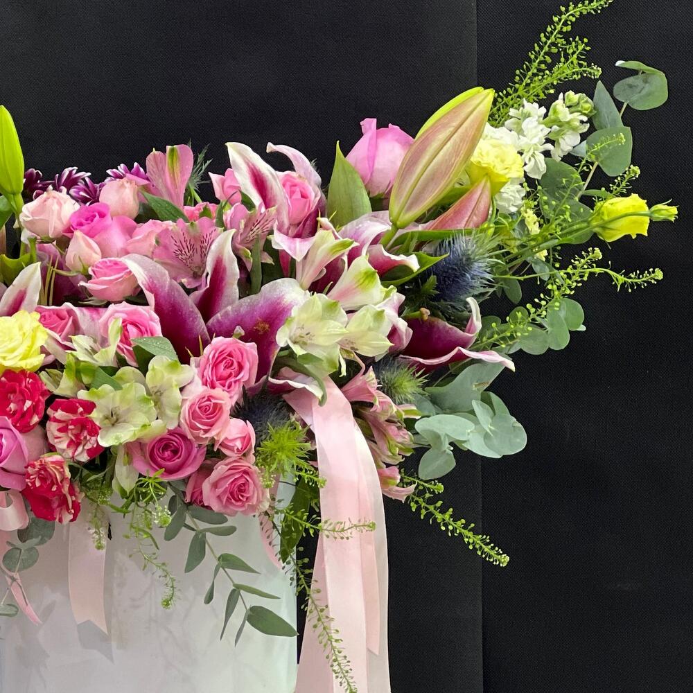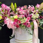 Eustoma - 5 pcs Eucalyptus - 5 pcs Hatbox - 1 pcs spray chrysanthemums - 5 pcs ribbons - 2 pcs floral foam (oasis) - 3 pcs pink lilly - 5 pcs roses - 8 pcs spray roses - 5 pcs astromaria - 5 pcs lipidiyum - 5 pcs