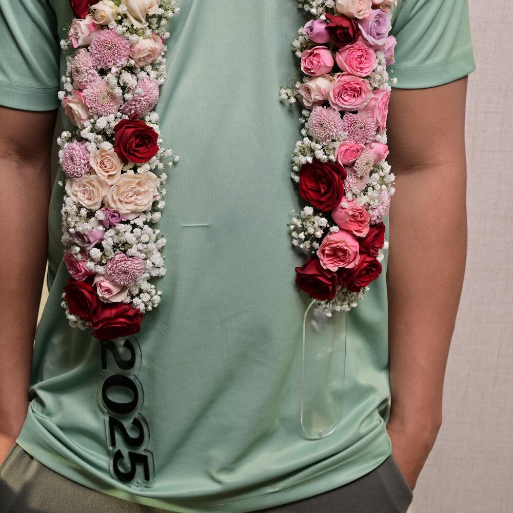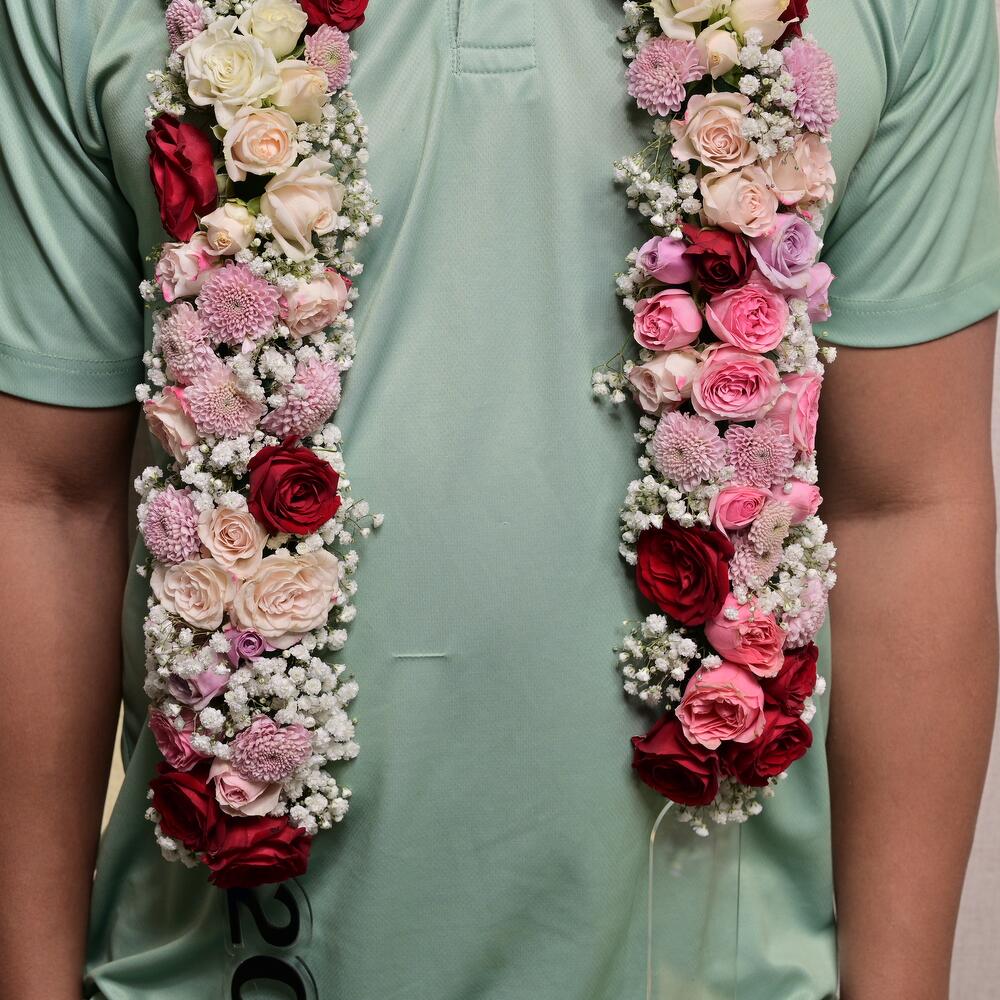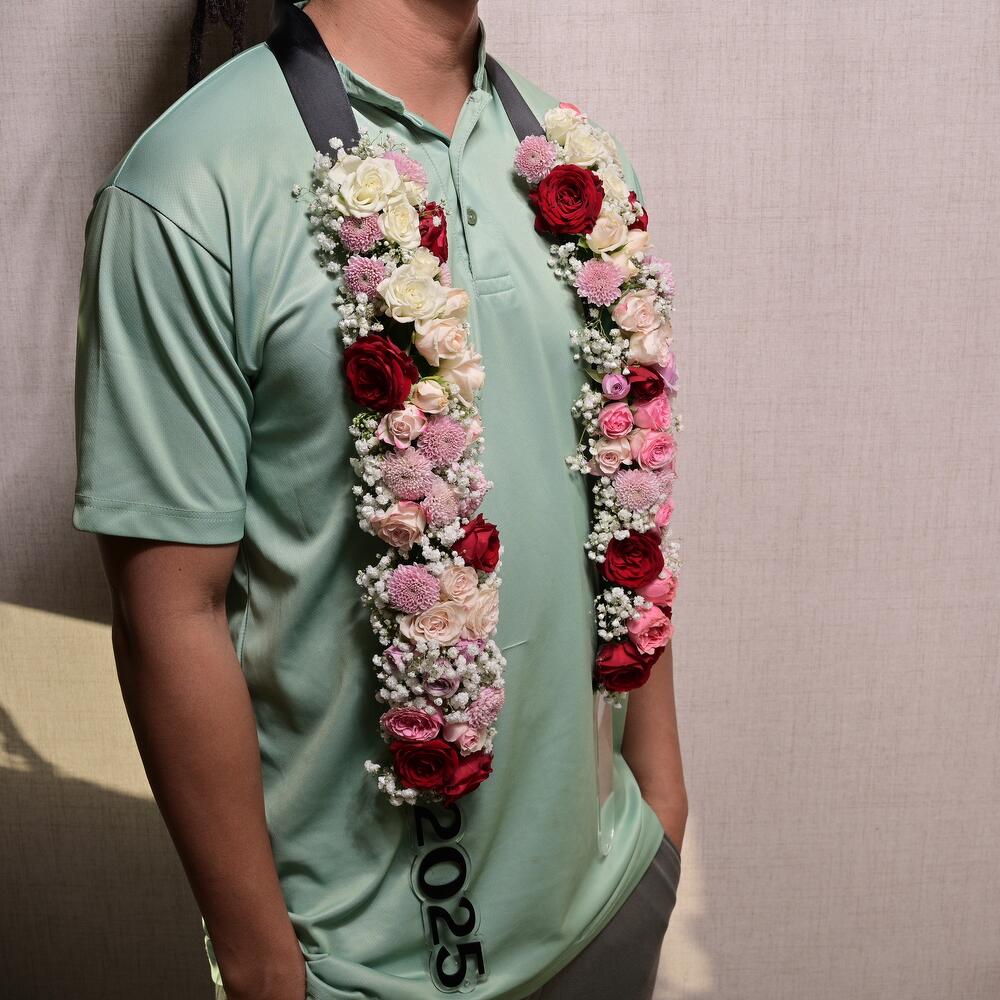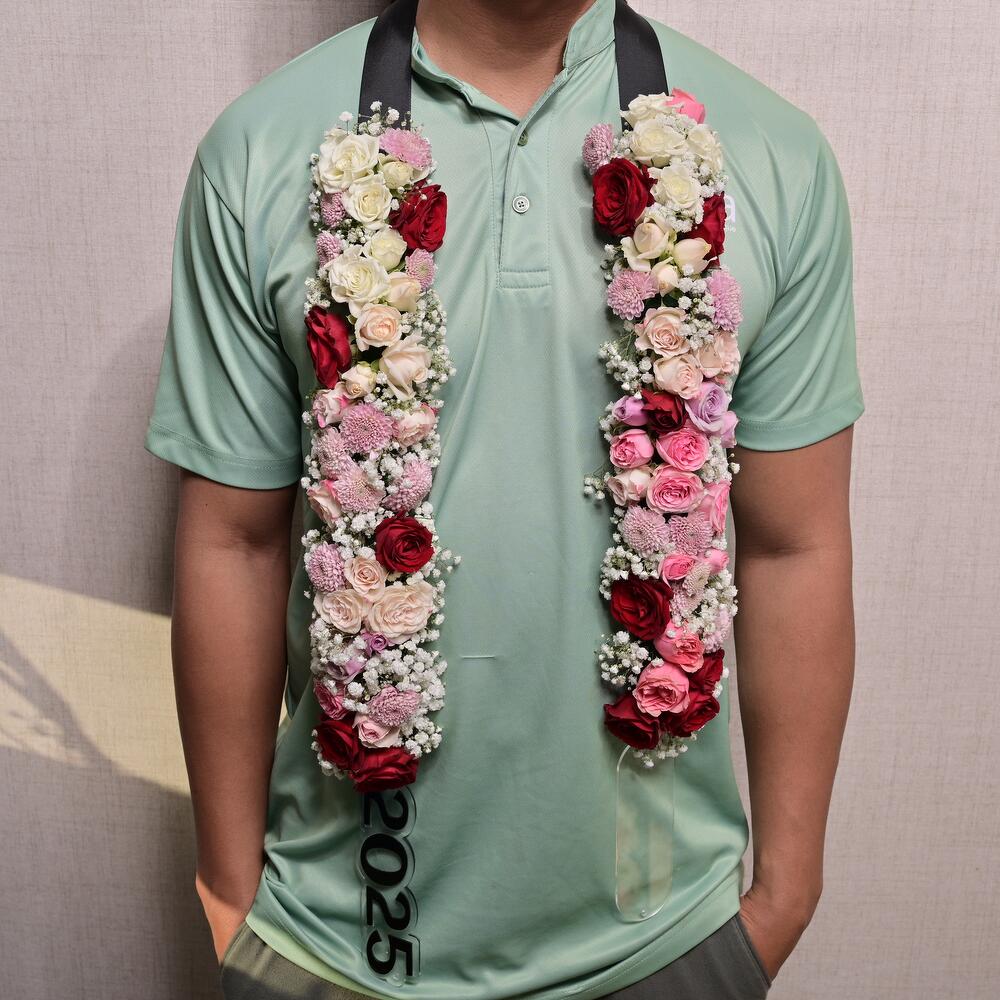 Celebrate a special occasion with this stunning Floral Necklace designed to add a sophisticated touch to any event. This luxurious garland features a mix of premium flowers and elegant accents, making it perfect for graduations, weddings, or other important milestones.