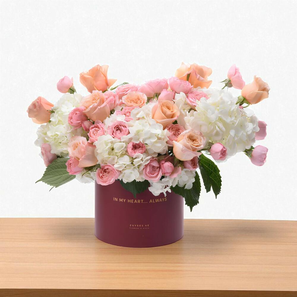 Experience the timeless allure of the Floral Odyssey Beloved Box, a luxurious floral arrangement crafted to celebrate love and cherished moments. Beautifully presented in an elegant box adorned with the heartfelt message In My Heart...Always, this design radiates romance and affection.