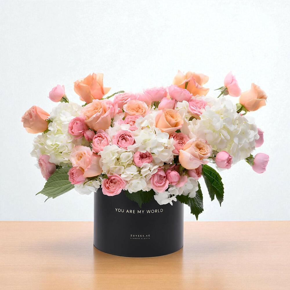 Experience the timeless allure of the Floral Odyssey Heartfelt Love Box, a luxurious floral arrangement crafted to celebrate love and cherished moments. Beautifully presented in an elegant box adorned with the heartfelt message YOU ARE MY WORLD, this design radiates romance and affection.